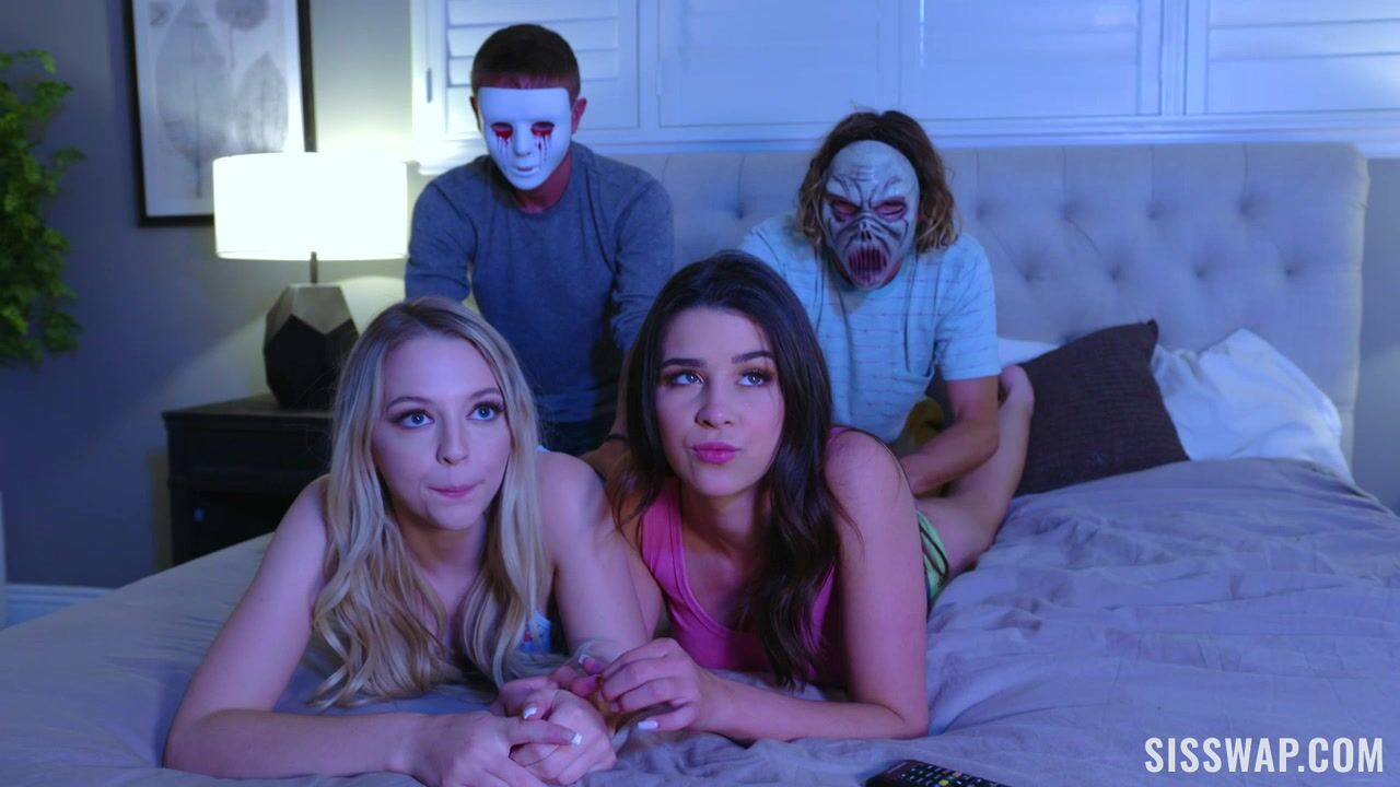 Kylie Rocket позвала в гости свою лучшую подругу Lily Larimar и ее брата, чтобы посмотреть весте ужастики. Пока девушки дрожат в обнимку в постели, их браться надели маски и возбудили сестер куннилингусом, ведь групповой секс намного приятней просмотра фильма! Обмен молодыми сестрами увенчался камшотом на их плоские животы.